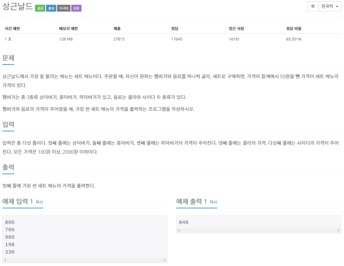 입력은 총 다섯 줄이다. 첫째 줄에는 상덕버거, 둘째 줄에는 중덕버거, 셋째 줄에는 하덕버거의 가격이 주어진다. 넷째 줄에는 콜라의 가격, 다섯째 줄에는 사이다의 가격이 주어진다. 모든 가��